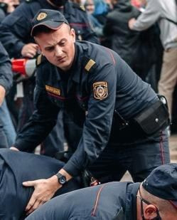 Избивал беларусов в Витебске на Марше Героев 13 сентября 2020 года. Более того, прославился тем, что исподтишка распылял газ на стоящих рядом мирных женщин.