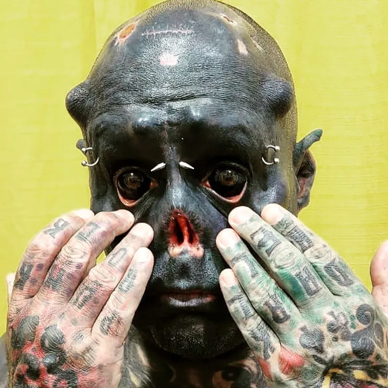 Фернандо Франко де Оливейра (Fernando Franco de Oliveira) покрыл татуировками около 99% своего тела, включая соственные глазные яблоки, которые теперь имеют полностью чёрный окрас . Кроме того, мужчина даже вживил себе в голову имплантаты, имитирующие рога .