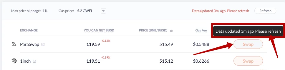 Иногда, если вы долго размышляете перед выполнением обмена, котировки могут устареть, и их необходимо обновить. В таких случаях перед тем, как нажать на кнопку "Swap" (Обмен), рекомендуется обновить котировки, нажав на "Please refresh" (Пожалуйста, обновите).