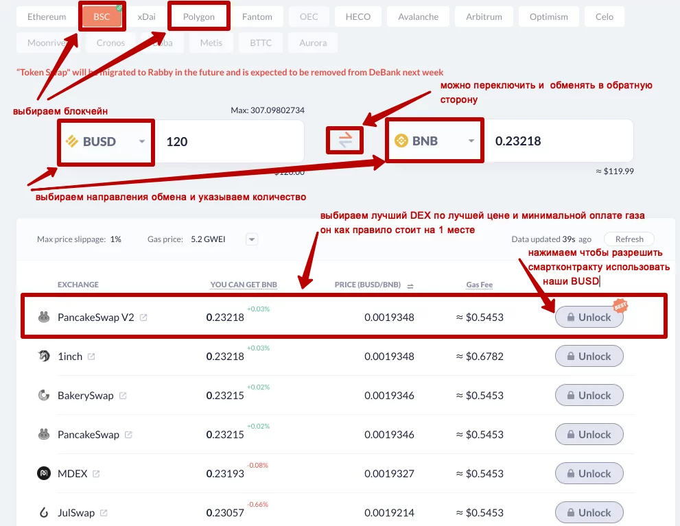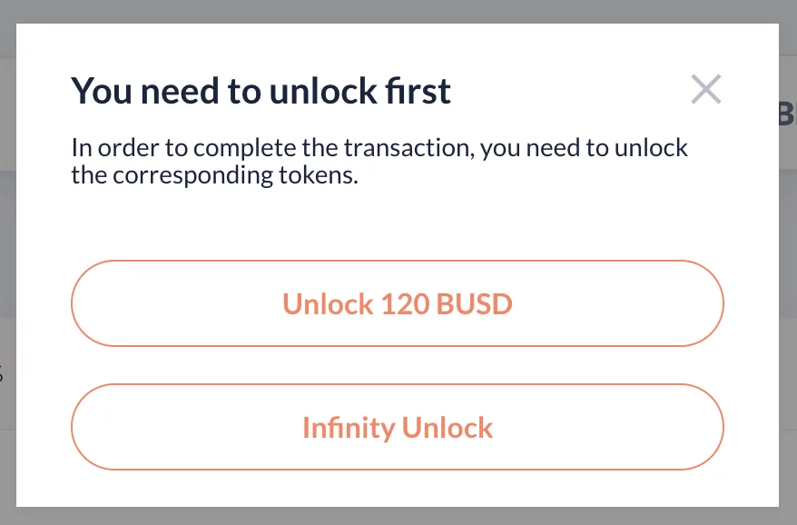 Можно безопасно сделать апрув (анлок) только на указанную сумму, но в таком случае при следующем обмене через этот DEX придется заново платить комиссию за газ. Поэтому я предпочитаю делать Infinity Unlock - разблокировку на любую сумму. Это позволит мне отозвать разрешение у смартконтракта на использование моих BUSD в любой момент.