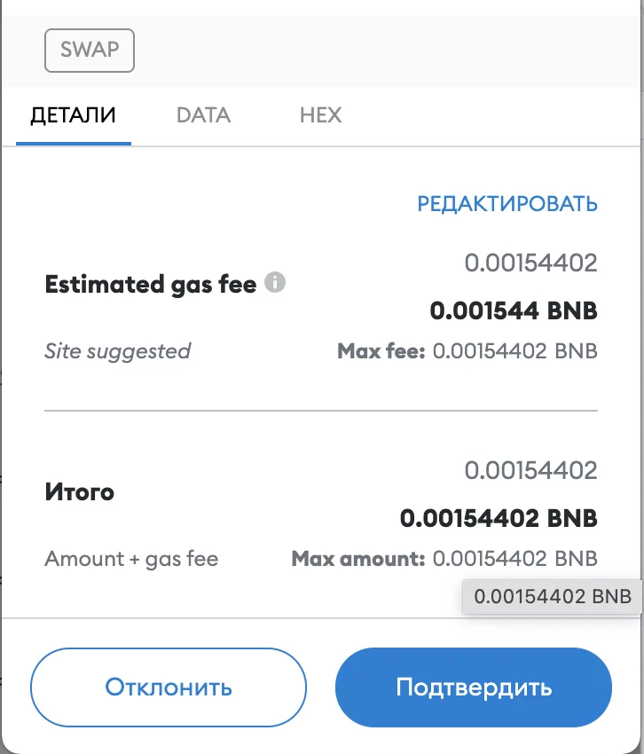 9. После этого подписываем транзакцию обмена и вновь платим за газ