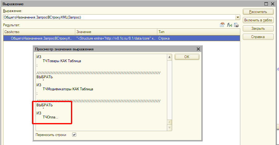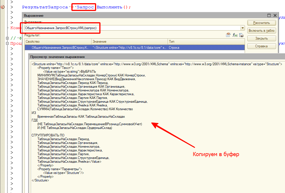 // «Вычислить выражение»(Shift + F9), скопировать полученный XML в поле "Текст запроса"