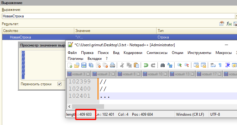При этом значение этого показателя не является константой и скорее рассчитывается от используемых символов. Например, если вывести значение строки состоящий из повторяющихся //, то вместится 409 603 символа, если вывести кириллические буквы Аа, то вместится - 614 403 символа, а вот если вывести латинские Aa, то получим снова 409 603 символа.