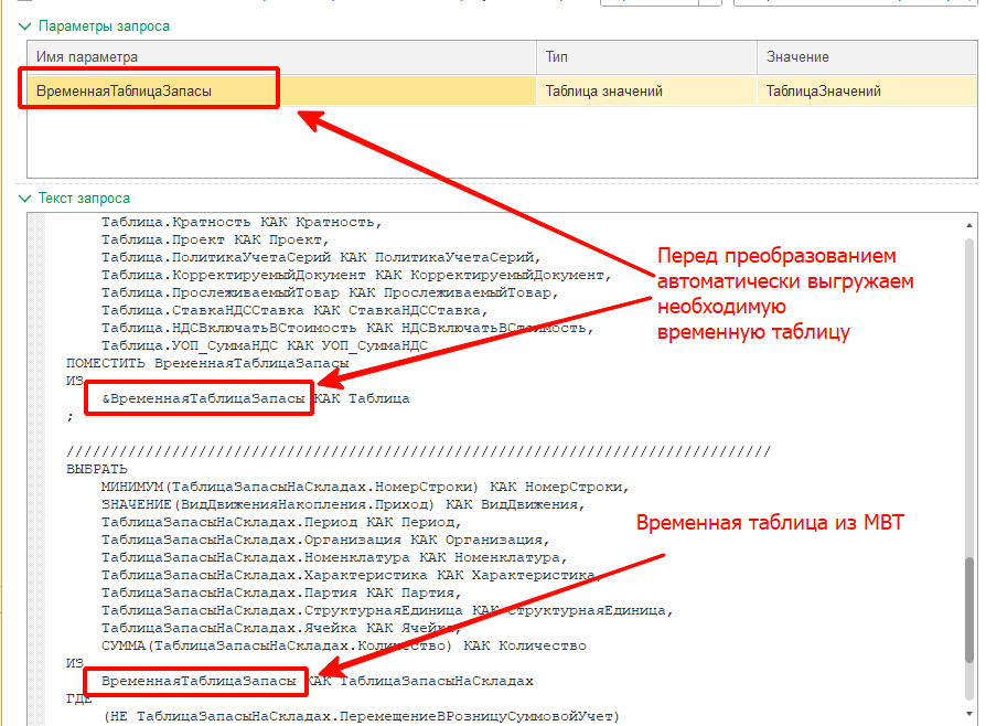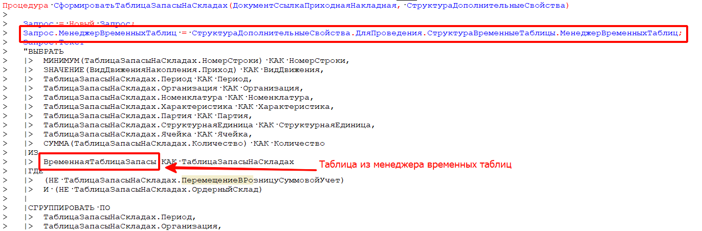 В типовом коде весьма часто используется менеджер временных таблиц, который позволяет переиспользовать временные таблицы выполненных запросов в других запросах. Например, при обработке проведения данные табличной части дополняются полями шапки и помещаются во временную таблицу, а уже во всех других запросах используется именно данная временная таблица.