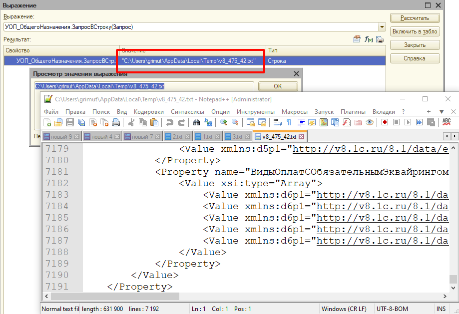 // "Вычислить выражение" (Shift + F9), скопировать полученный XML в поле "Текст запроса"