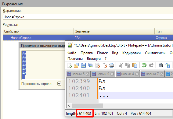 Второй особенностью является ограничение в количестве выводимых символов в окне "Просмотр значения выражения", после которого текст обрезается.