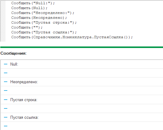 Третьей особенностью оказалась нехватка представления для анализа. Во первых потому что значение представления NULL, неопределено, пустой строки и пустой ссылки совпадает. И визуально их идентифицировать весьма трудно.