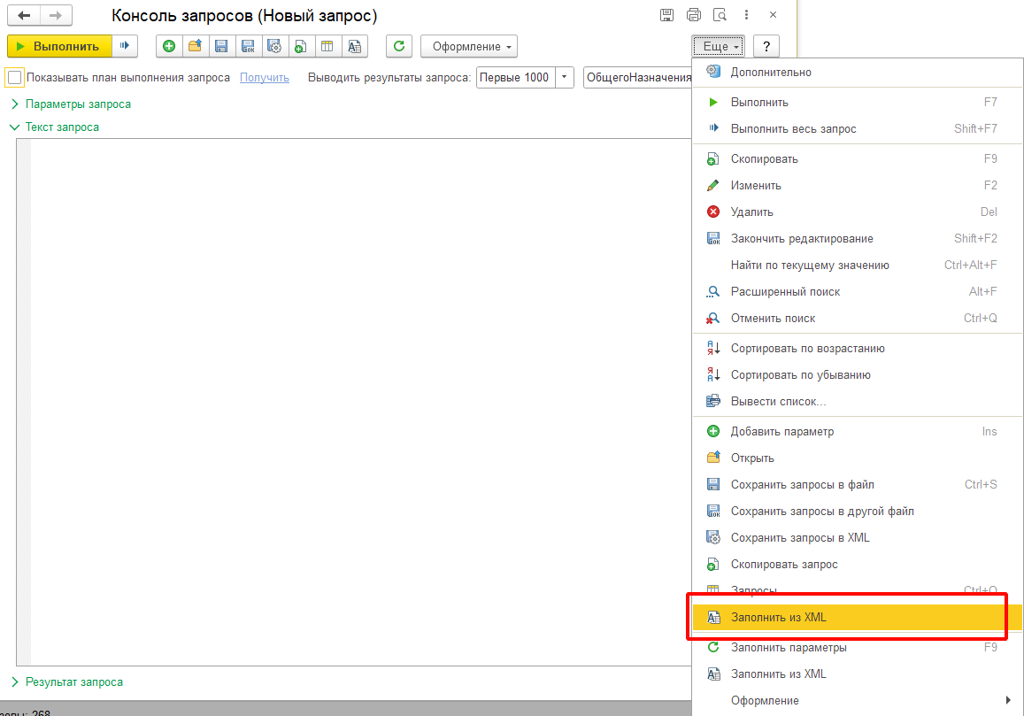 // консоли запросов и выполнить команду "Заполнить из XML" из меню "Еще".