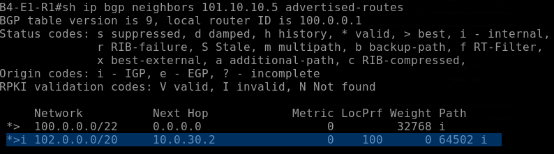 Router # show ip bgp vpnv4 all BGP table version is 43, local router ID is 172 .16 .1 .1 Status codes: s suppressed, d damped, h history, * valid, > best, i - internal, r RIB-failure, S Stale Origin codes: i - IGP, e - EGP, ? - incomplete Network Next Hop Metric LocPrf Weight Path Route Distinguisher: 1:1 ( default for vrf vrf_trans) VRF Router ID 10 .99 .1 .2 *> 172 .22 . . 0 .0 .0 .0 0 32768 ? r> 172 .23 . . 172 .23 .1 .1 0 0 3 1 ? *>i10 .21 .1 .1/32 192 .168 .3 .1 0 100 0 2 i *> 10 .52 .1 ./24 172 .23 . . .