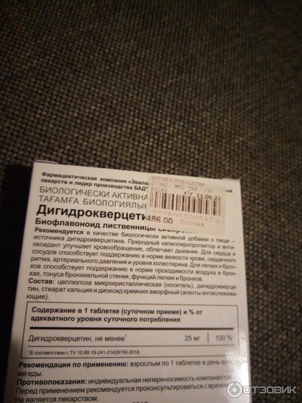 Гораздо реже пациенты сообщают о неэффективности препарата . Цена на Дигидрокверцетин в аптеках В среднем цена на Дигидрокверцетин составляет 163‒217 руб . за упаковку, содержащую 20 таблеток, или 374‒459 руб . за упаковку, содержащую 60 таблеток . Препарат в форме капсул на данный момент в продаже отсутствует . Дигидрокверцетин: цены в интернет-аптеках