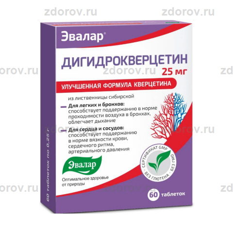 Дигидрокверцетин 100 мг- инструкция, цена 727 руб | купить на официальном сайте Эвалар | Отзывы и инструкция по применению . Дигидрокверцетин 100 мг . Улучшенная формула кверцетина в дозировке 100 мг в 1 таблетке для поддержания здоровья бронхолегочной системы .