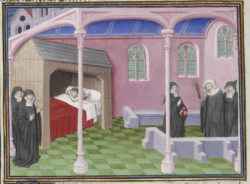 В ту ночь аббатиса была в обществе священника, которого она часто препровождала к себе в сундуке. Услыхав это и боясь, как бы монахини от излишней торопливости и рвения не налегли на дверь и она не отворилась, настоятельница поспешно встала, оделась, как попало, впотьмах и, полагая, что берет некий вуаль в складках, который они носят на голове и называют сальтеро, взяла поповские штаны, и такова была ее поспешность, что, не спохватившись, она набросила их на голову вместо сальтеро и, выйдя тотчас же, заперла за собой дверь, говоря: «Где эта проклятая господом?» Вместе с другими монахинями, не замечавшими, вследствие страстного желания застать Изабетту на месте преступления, что у настоятельницы на голове, она подошла к двери кельи и при помощи других высадила ее; войдя, они нашли обоих любовников, обнимавшихся в постели. Ошеломленные тем, что были накрыты врасплох, и не зная, что предпринять, они не двинулись. Девушку тотчас же схватили другие монахини и по приказу настоятельницы повели в капитул, а молодой человек остался и, одевшись, стал поджидать, чем все это кончится, намереваясь разделаться со всеми, кто попадется ему под руку, если бы с его милой учинили что-либо необычное, а ее самое увезти с собою.
