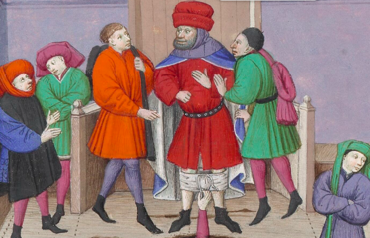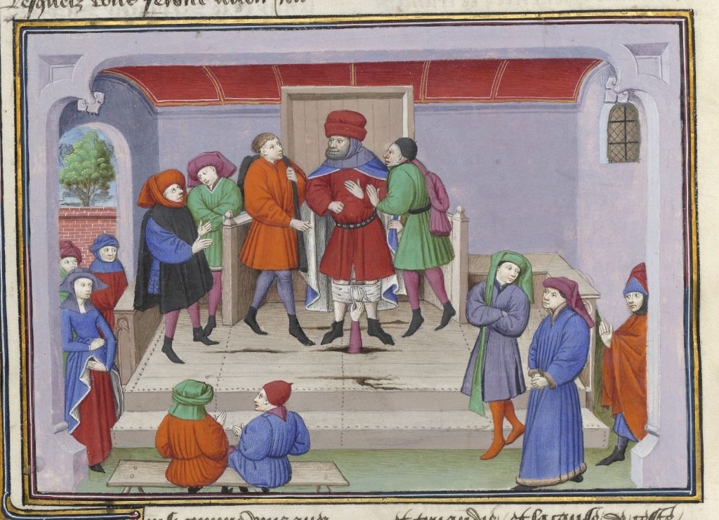 Если мы обратимся к исходному тексту, все становится ясно: у Боккаччо здесь появляется слово “le brache”, которое, вероятно, следовало бы перевести как “трусы”. Читателю XIV-го и XV-го века было очевидно, что речь идет о трусах; так же, в подтверждению выше сказанного, этот рассказ был проиллюстрирован в парижской рукописи, хотя художник все равно подверг цензуре вид, который предстал перед собравшимися после того, как шутники расправили платье судьи.