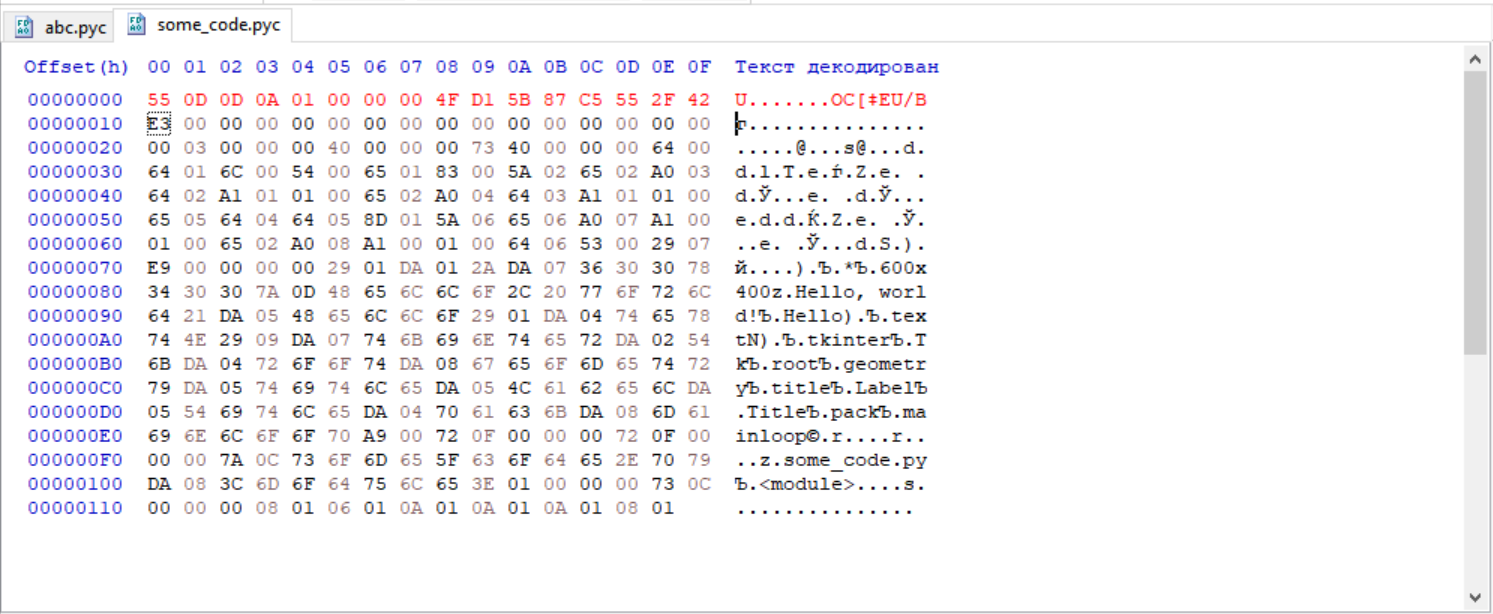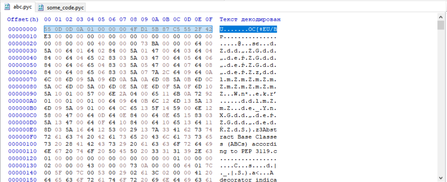 Открываете HxD и перекидывайте в него файл exe.pyc(тот у которого вы меняли расширение) и файл abc.pyс из архива base_library.