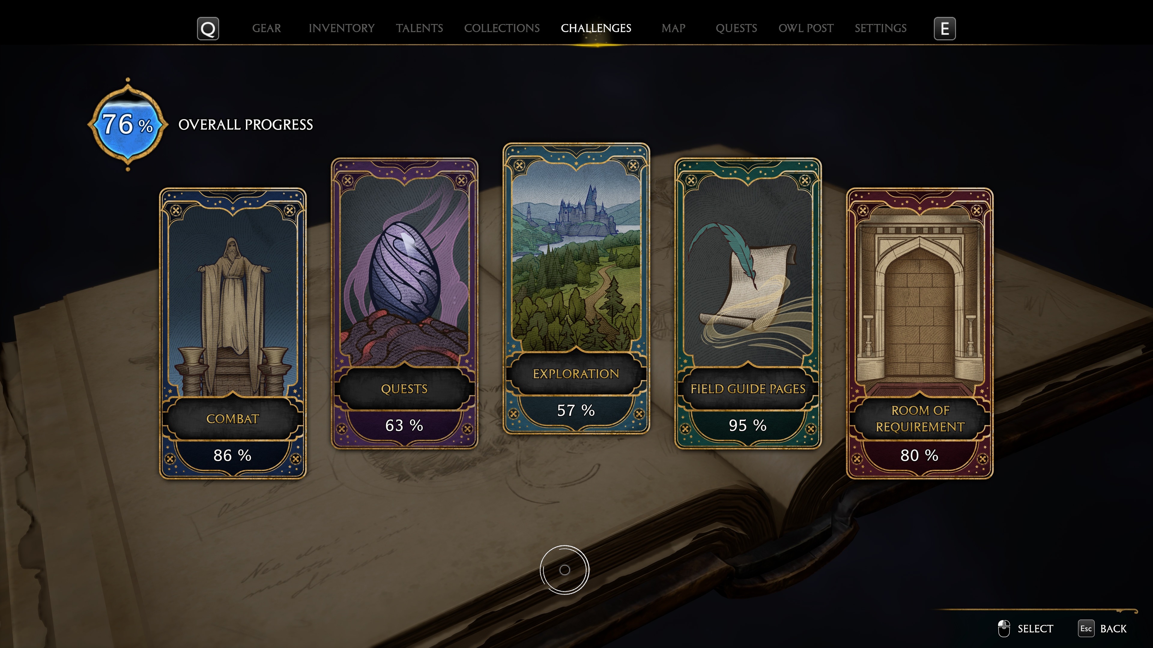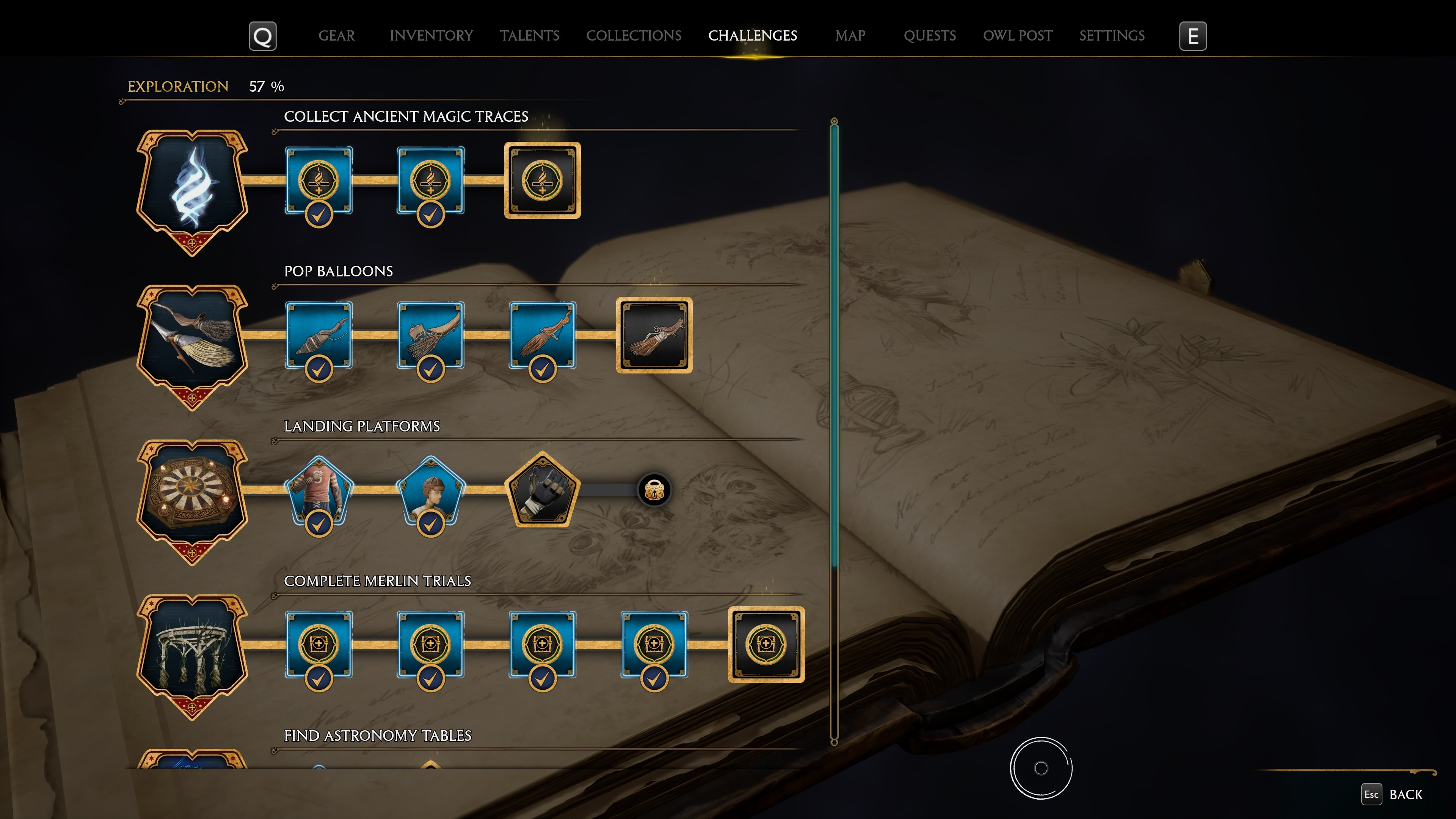 Эти страницы зачастую содержат интересные факты о мире Поттерианы или небольшие самостоятельные истории. Есть также и условно пустые страницы, которые не дают текст и просто добавляются "в копилку". В какой-то момент они даже понадобятся по сюжету, так что причин их собирать достаточно. Помимо них в игре есть ещё коллекционные сундуки, которые в отличие от обычных с рандомным лутом, отмечаются на карте и содержат либо уникальную шмотку, либо украшение для выручай-комнаты. Плюс ещё есть специальный предмет, который понадобится для прохождения квеста на взлом замков. Вы его можете себе спойлернуть посмотрев чек-листы в разных локациях на карте, но опыт будет полнее, если вы с ними познакомитесь по прогрессу, когда они будут иметь существенную пользу.