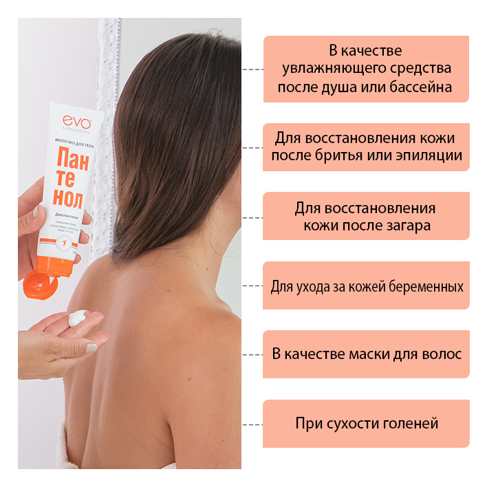 Молочко для тела Пантенол EVO: описание, преимущества, способ применения, результаты и отзывы . Молочко с пантенолом EVO увлажняет кожу в течение 24 часов . Эффективно восстанавливает сухую и раздраженную кожу тела . Молочко пантенол эво эффективно от солнечных ожогов .
