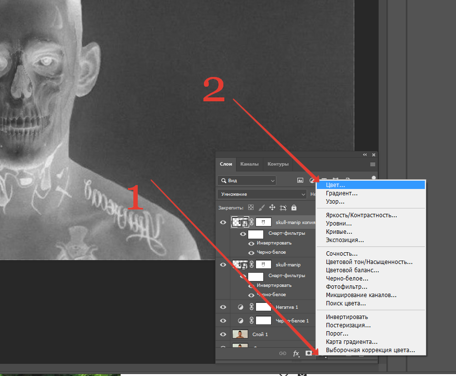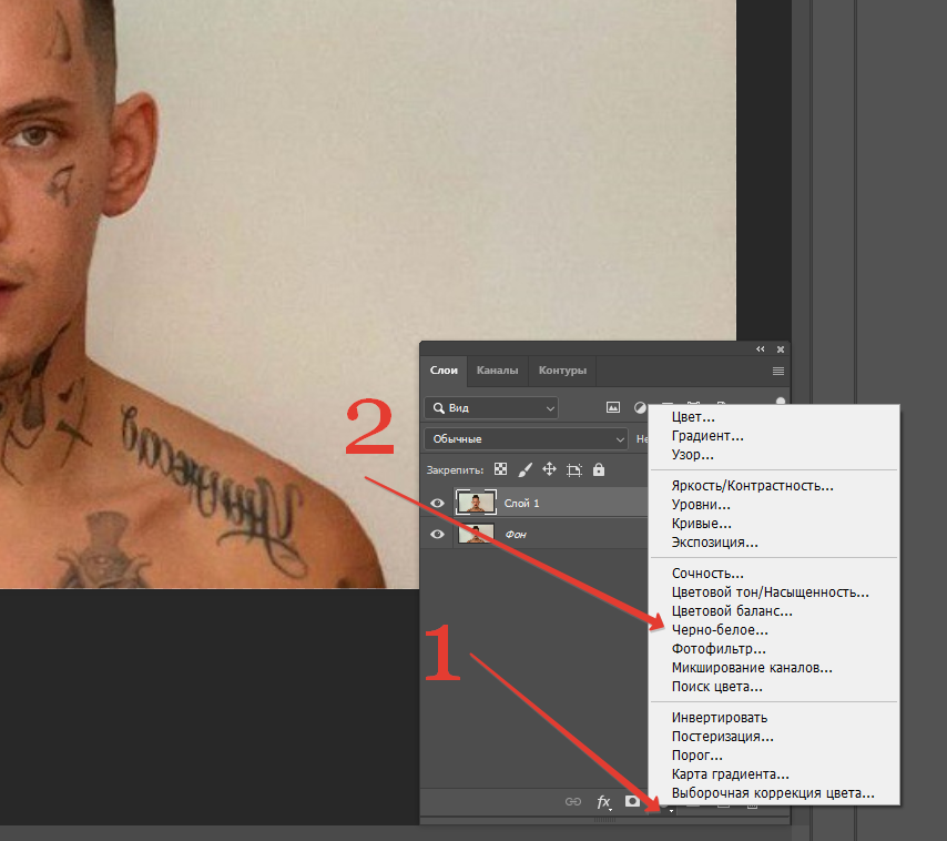 Далее идем в корректирующие слои (1) и выбираем черно белое(2)