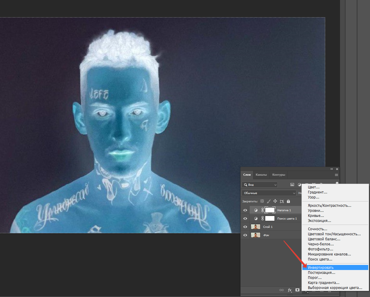 Теперь опять идем в корректирующие слои и нажимаем инвертировать