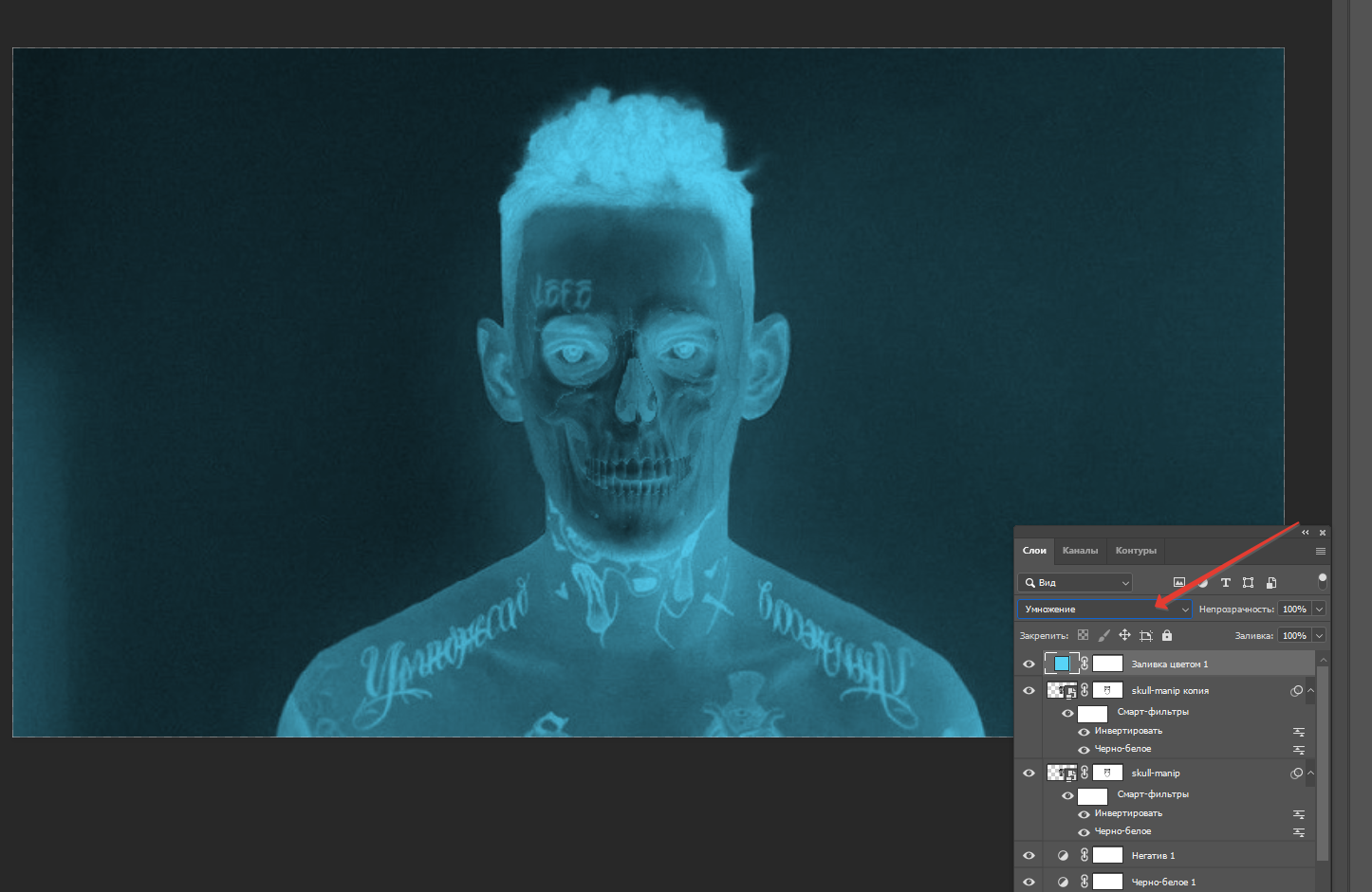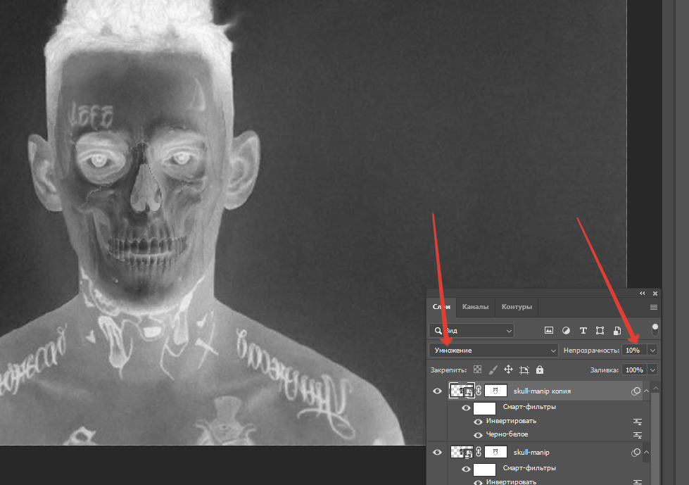 После чего меняем режим наложения на умножение, и все, фото рентгене готово.