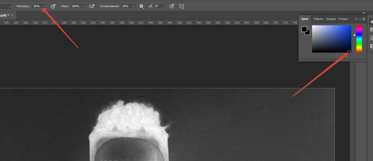 Теперь выбираем кисть (Клавиша B) прозрачность около 50 % и черный цвет