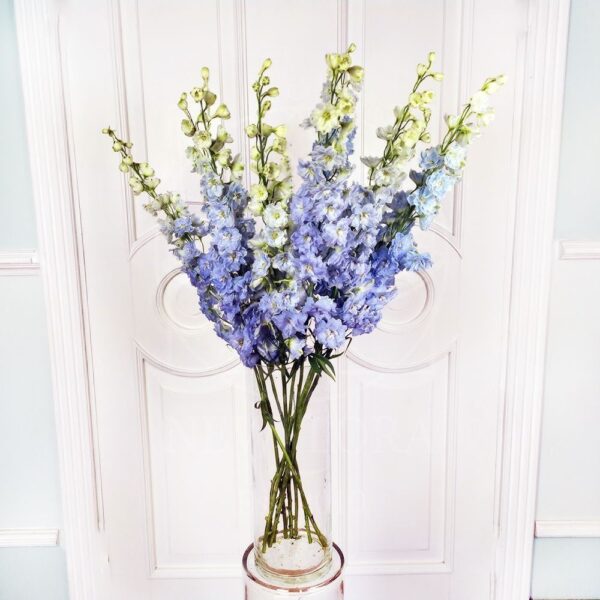 Для ваз используется дельфиниум культурный (Delphinium cultorum) . Цветы следует срезать, когда соцветия развиты наполовину . Тогда они стоят в вазе 3-6 дней .