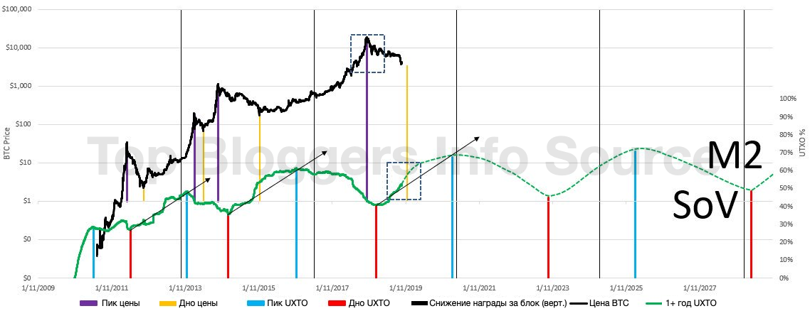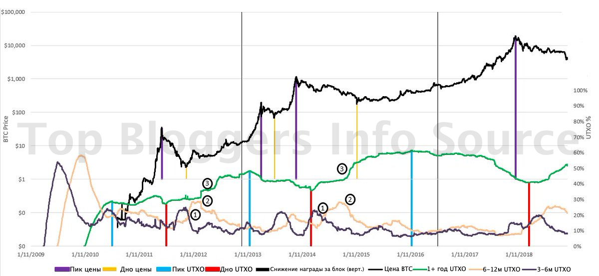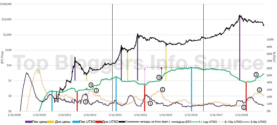 Используя полученные данные, мы можем определить даты этих событий. Общей чертой обоих циклов был плавный рост линии не потраченных выходов за период более одного года к её пику и последующее плавное снижение. Траектория линии не потраченных выходов не линейна, но самые низкие и самые высокие точки каждого цикла могут быть отмечены на похожих паттернах.
