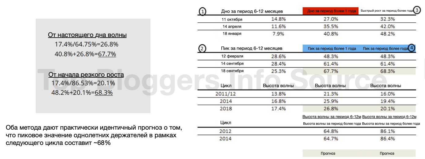 Мы используем исторические циклы цены для обнаружения логических и постоянных трендов, чтобы спрогнозировать начало следующего цикла и картину не потраченных выходов на нём. Мы проанализировали, как высота линии, представляющей не потраченные выходы за 6-12 месяцев, повлияла на линию категории 1+ года на пиках удержания за 1 год во время предыдущих циклов.