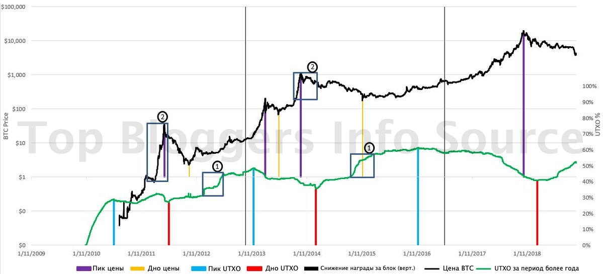 Зелёная линия на графике ниже представляет % Bitcoin, которые не покидали кошельков как минимум 1 год. Зонами с индексом 1 отмечены периоды сильного роста количества монет, которые более никуда не переводились (держатели), а зонами с индексом 2 отмечены цены, по которым были куплены эти монеты во время ралли цены.