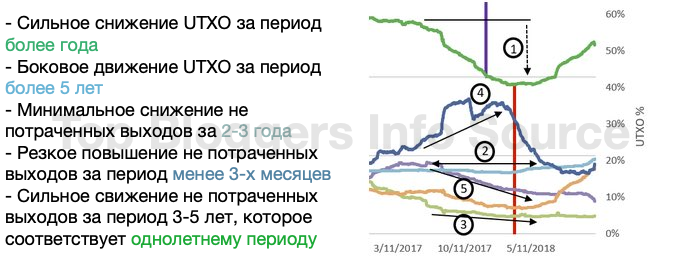 Отдельно взятая монета может перемещаться между категориями только в двух случаях: либо в более старшую категорию, если она не участвовала в транзакциях продолжительное время, либо в младшую, если она была перемещена между кошельками. Другими словами, снижения на любой из линий не потраченных выходов могут происходить немедленно, в то время как рост имеет временной лаг, который зависит от рассматриваемого временного периода.