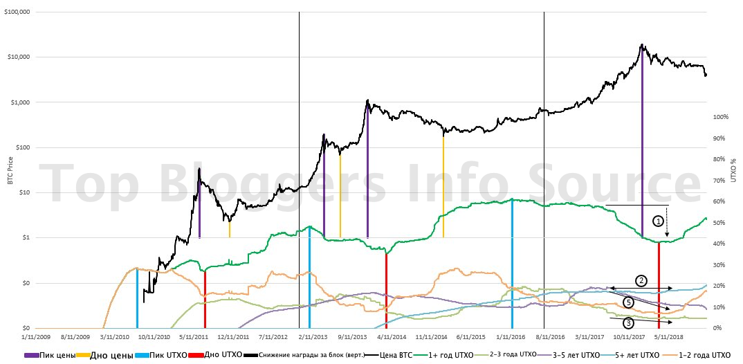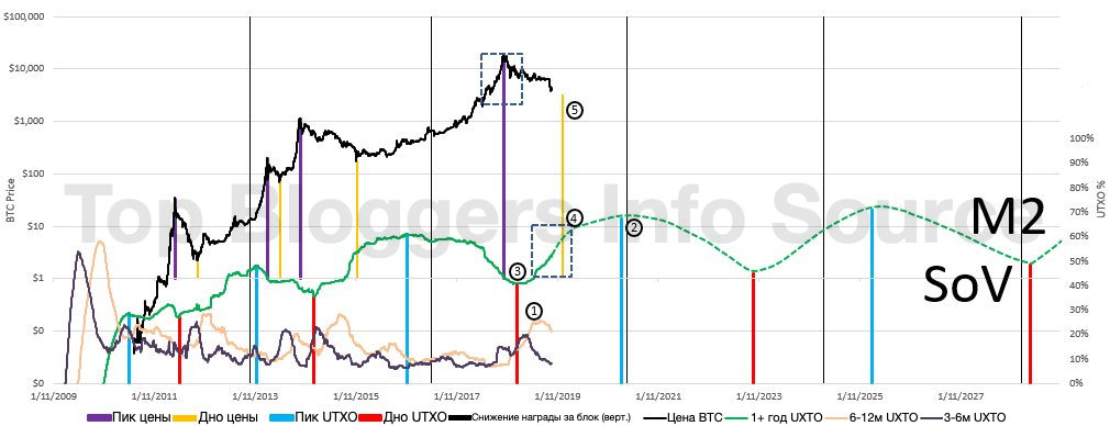 Мы определили самую низкую цену по отношению к пику линии не потраченных выходов за 6-12 месяцев (1), пиком проекции линии не потраченных выходов за период более одного года (2), имеющимся дном не потраченных выходов за период более года (3), а также проекцией точки замедления роста не потраченных выходов за период более года (4), получив кластер дат, указывающих на достижение Bitcoin дна в первом квартале 2019 (5).