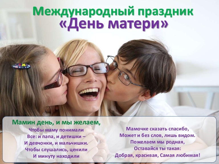 Я с днем матери тебя . Счастья, радости желаю, Нежно, искренне любя! *** Сегодня праздник, мама, День матери, твой день! Хочу сказать немало . Хороших слов тебе . Хочу, чтоб улыбалась, Твоя улыбка - класс!