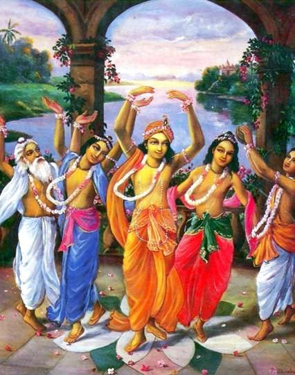 Здесь изображен Шри Чайтанья Махапрабху со Своими ближайшими спутниками, Гададхара Пандит - в красном.