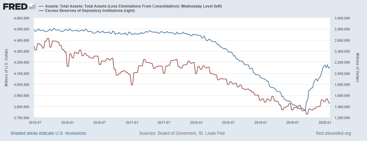 Красная линия - это избыточные резервы. Очевидно, что ФРС не спешит накачивать финансовый рынок избыточными резервами, на что также указывает рост ставки по ним, но об этом позже.