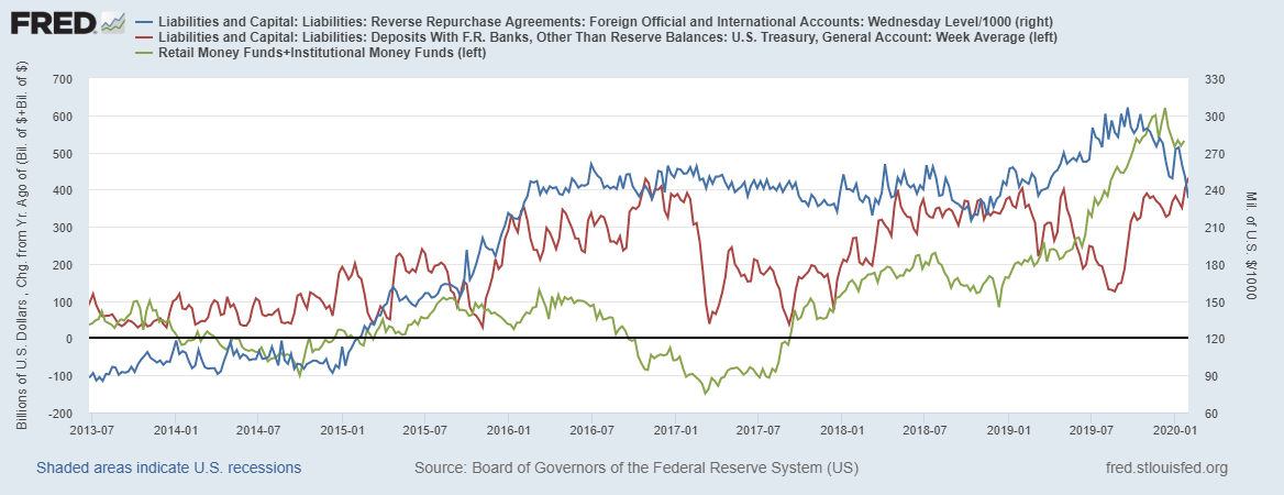 Синяя линия - РЕПО для нерезидентов, показатель сильно снижается, с пиков уже отошел на 70 млрд долларов, что нивелирует рост счета казначейства.
