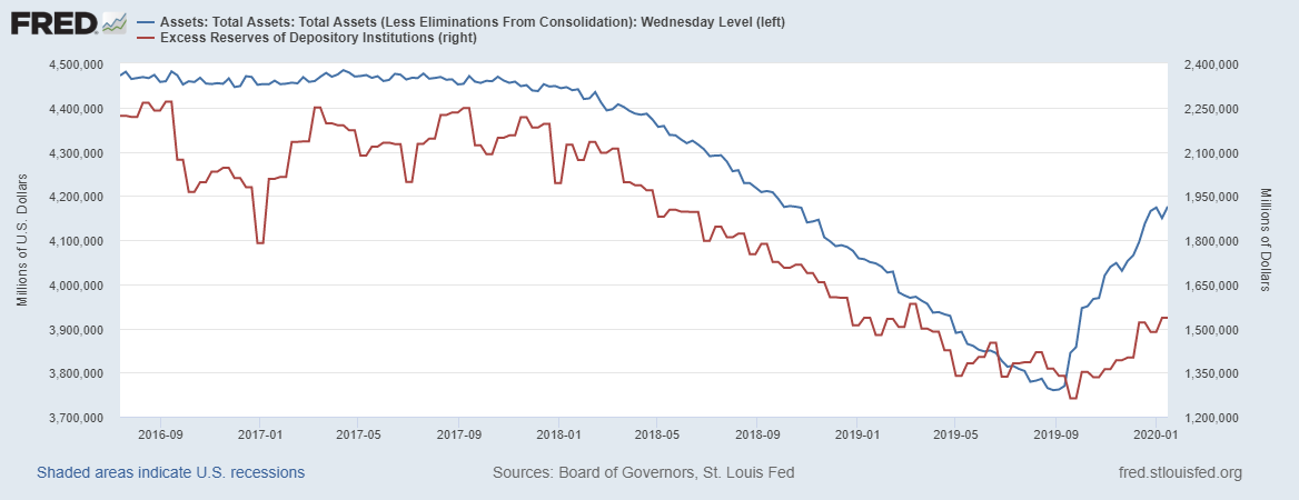 Как видим, избыточные резервы перестали расти, что сигнализирует о балансе денежного рынка США.