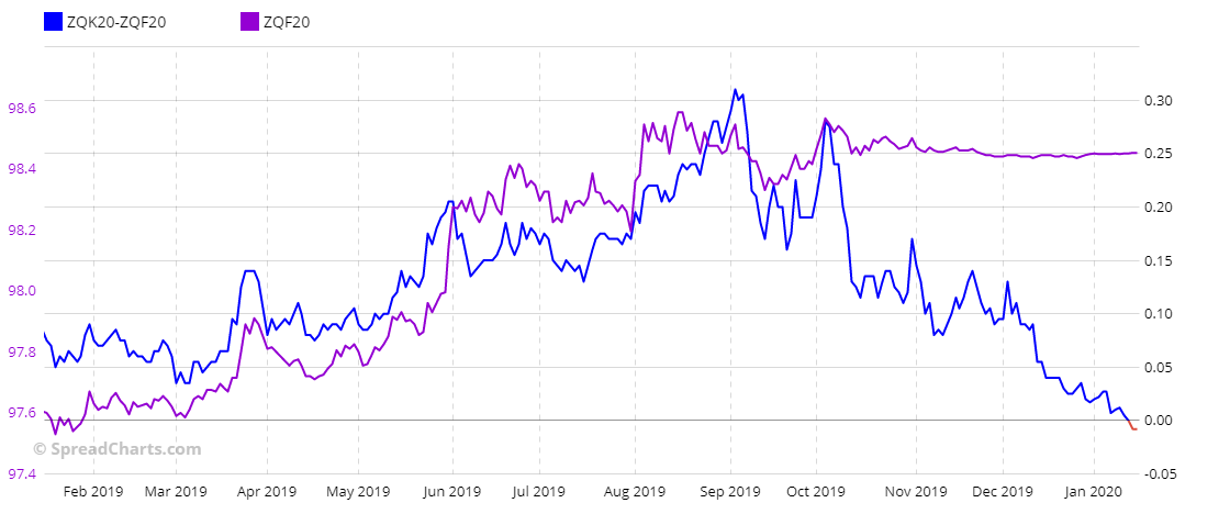 Синяя линия - это обратный спред между майскими фьючерсами и январским контрактом. Рынок локально ожидает завершение цикла снижения ставок и ставит на некую коррекцию.