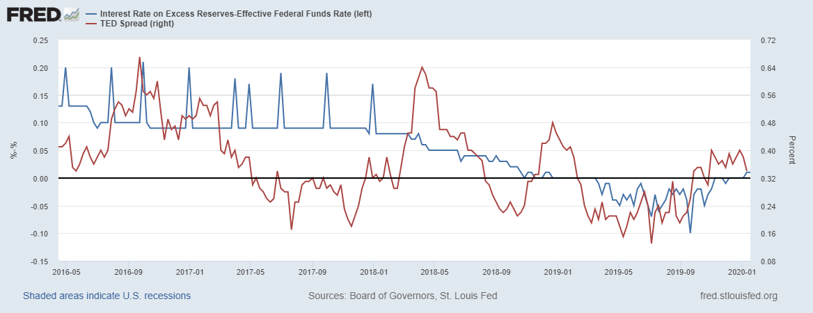 На первой картинке спред между ставками по избыточных резервам (назначается ФРС)и эффективной ставкой (рыночная ставка). Второй показатель - ТЕД-спред.