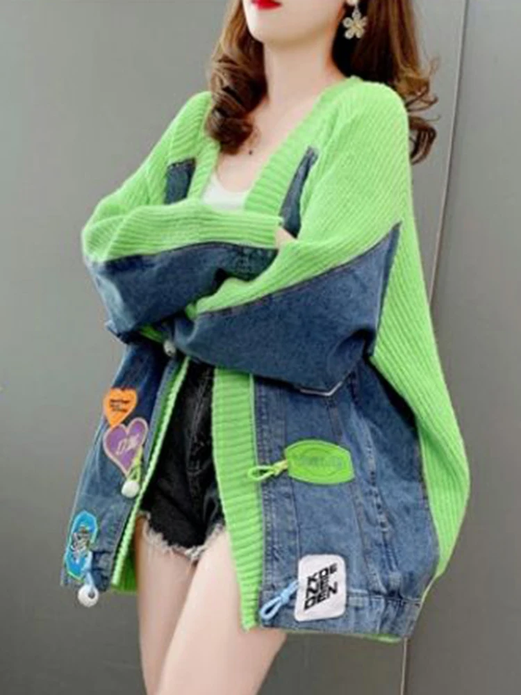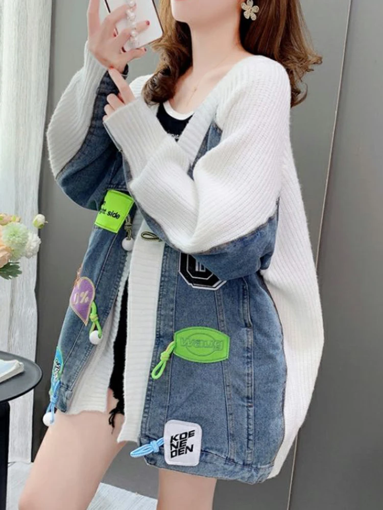 «Denim Patchwork Women Sweater Cardigans Autumn Winter New Loose Knit Cardigan Female Jacket Cardigan Jacket Sweater Female Coat» по лучшей цене на рынке! Всего за 34$ (3230рублей)