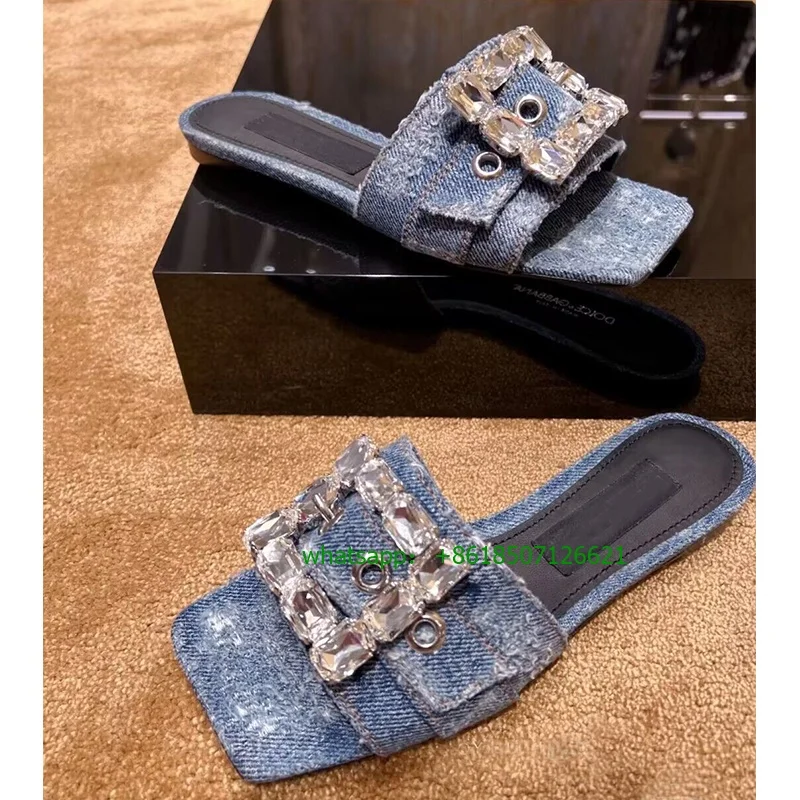 Denim Rhinestone Square Toe Flat Slippers Open Toe Plus Size Handmade Women's Shoes - Купить с бесплатной доставкой