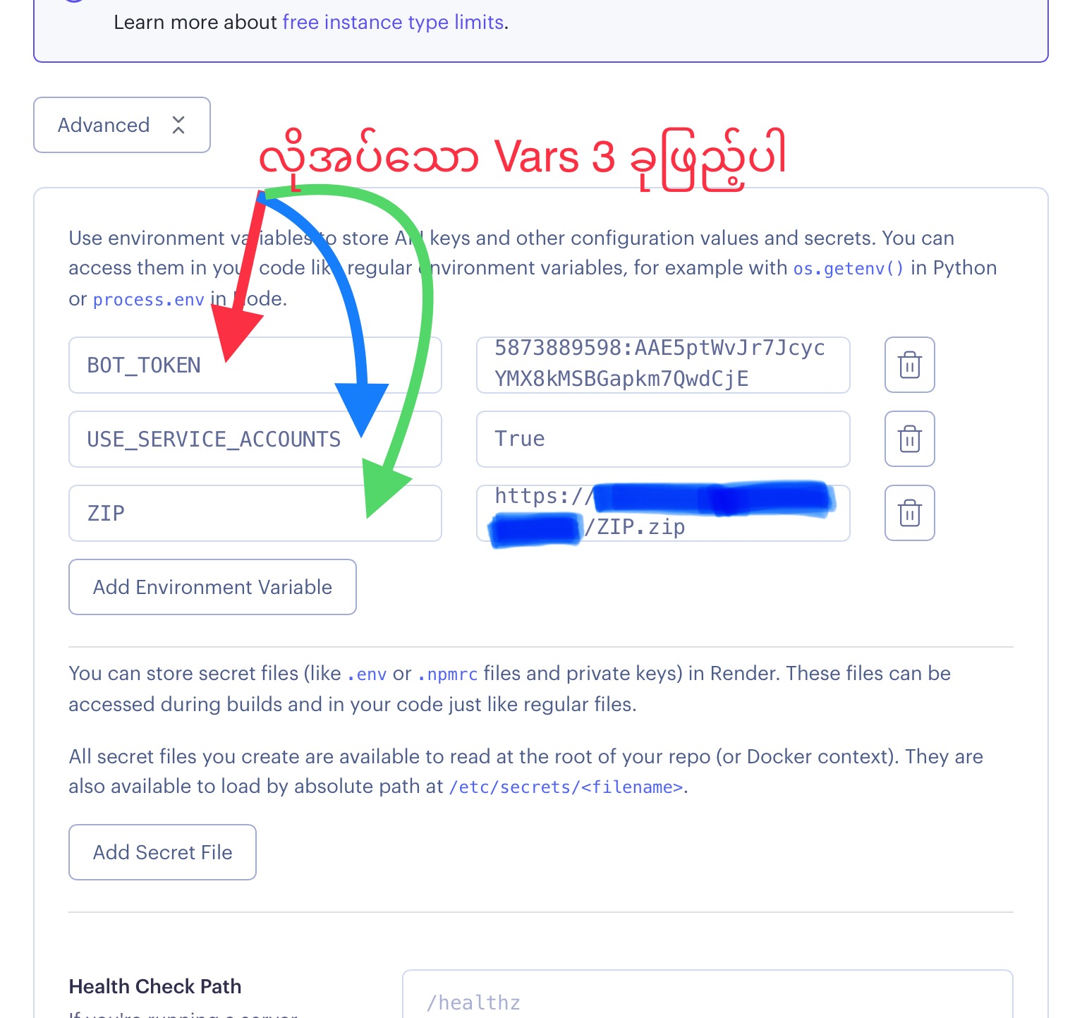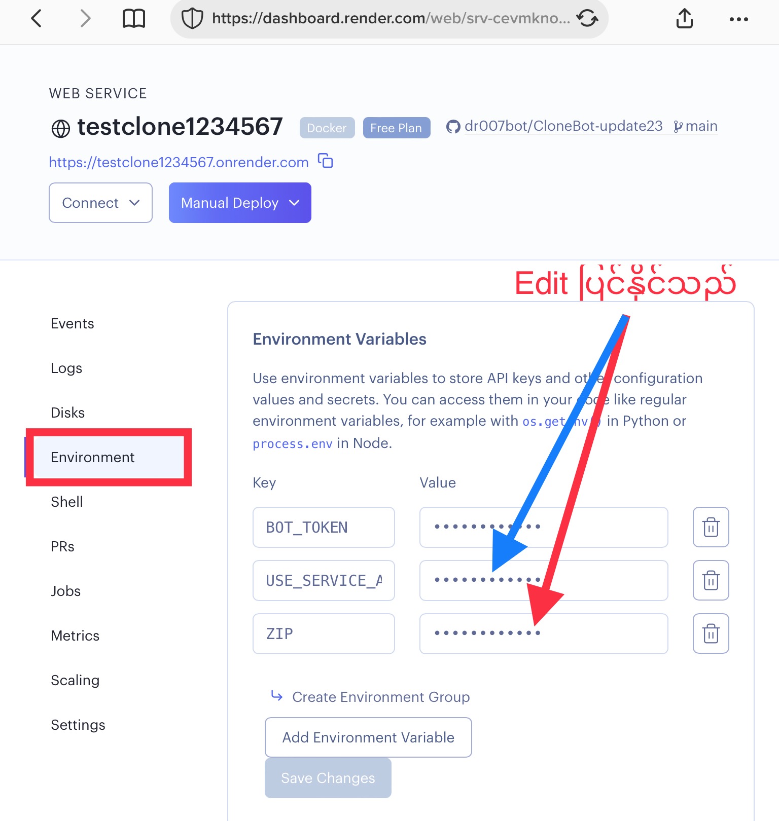 💥ကိုယ်ထည့်ထားတဲ့ vars တွေပြင်ချင်တာ ဥပမာ SA မသုံးတော့တာ/ Bot token ပြောင်းတာ/ Zip.zip link ပြောင်းချင်တာတွေရှိရင် အထက်ကလို environment ကို သွား ပြင်လို့ရပါတယ်