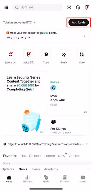 1. Tap on the "Add funds" button on the main page.