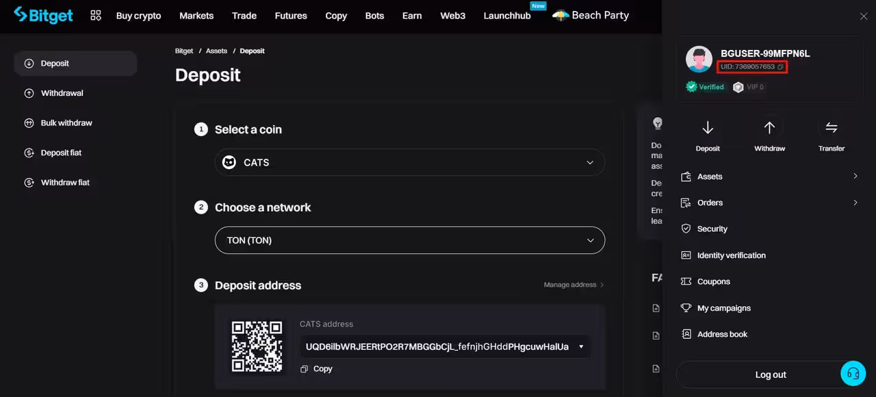 Deposit $CATS to Bitget