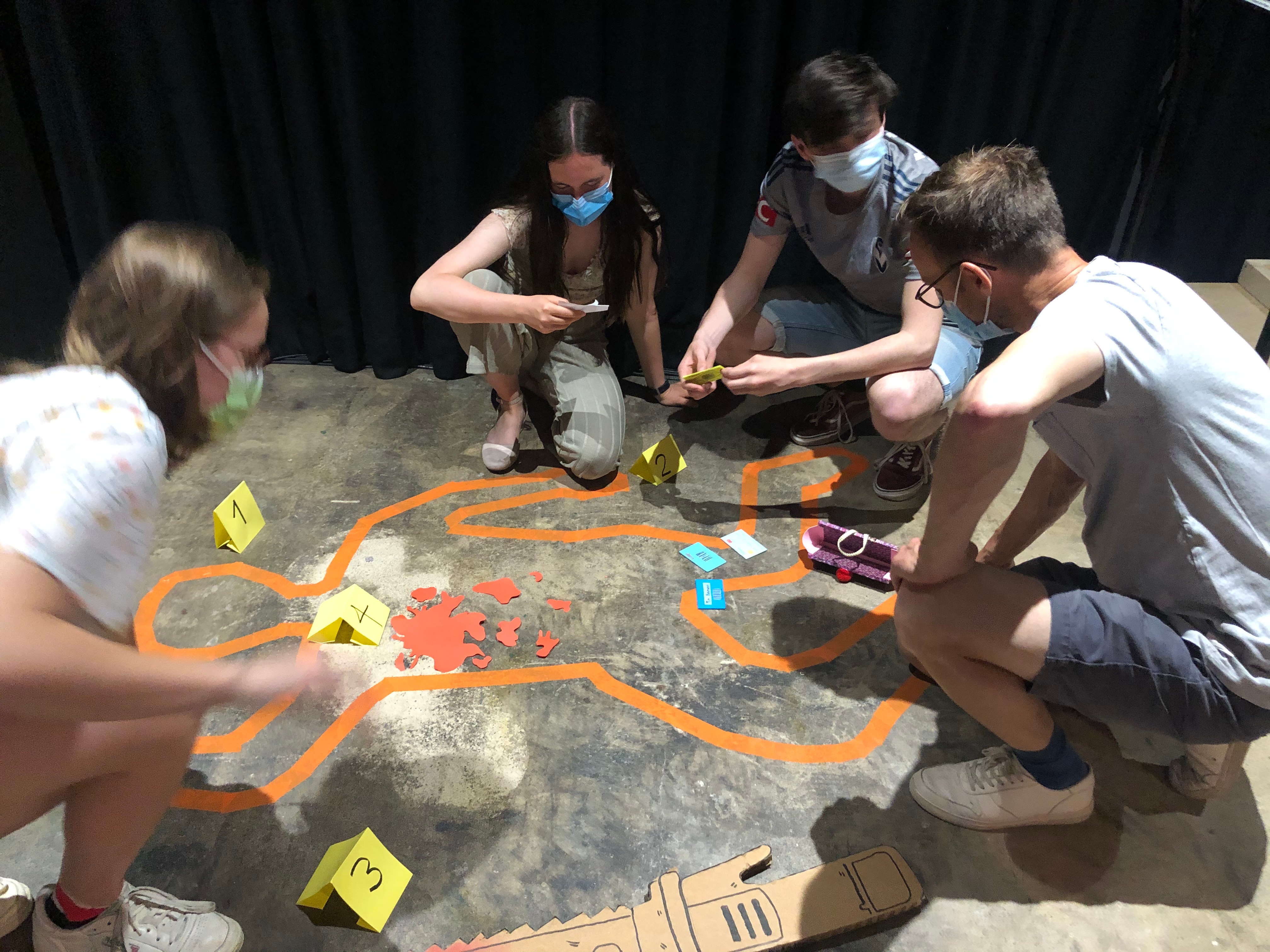Unsere erste Idee war es bereits einen Mordfall zu erstellen. Diese Idee hat sich dann bis zum Schluss durchgesetzt. Wir waren alle begeistert davon. Nun war die Frage, wie wir den Ort des Mordes dekorieren. Unsere erste Idee war es, dass wir den Umriss der Leiche mit Klebeband auf dem Boden abkleben und eine Hand darstellen, welche auf die Bar zeigt. Wir fanden die Idee mit dem Klebeband gut, haben jedoch die zeigende Hand weggelassen und diese durch ein Portemonnaie ersetzt, welche ein paar Hinweise zur Bar beinhaltet. Bei unserem ersten Testlauf lief dies eher schwammig, denn die jungen Testpersonen hatten noch nie etwas von den alkohoischen Getränken gehört. Stattdessen schauten sie sich im Raum umher und suchten nach anderen Hinweisen wie z.B. unter der Bühne oder unter Tischen und Stühlen. Bei unserem Lauf mit den Jugendlichen lief es super und ohne Hinweise, denn ihnen waren die Getränke bekannt und sie haben sofort umgeschaltet und gewusst, sie müssen zur Bar. Die Mordwaffe war angeblich de Kettensäge. Zur Leiche haben wir ausserdem noch vereinzelt Blutflecken geklebt und gelbe Kärtchen aufgestellt.