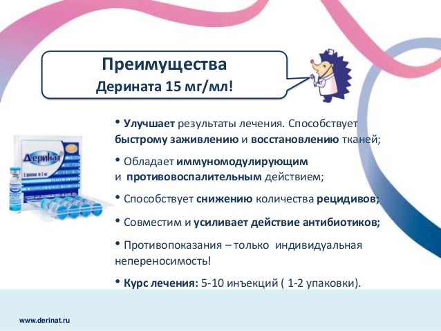 Как самостоятельное средство уколы Дерината также применяют в хирургической практике, назначая их пациентам как в пред-, так и в послеоперационном периоде . Противопоказания Инъекции и капли Деринат не имеют других противопоказаний, кроме непереносимости пациентом входящих в его состав компонентов . Побочные действия
