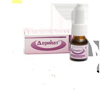 Состав и форма капель Деринат Деринат — прозрачная жидкость без цвета и запаха . Действующее вещество — натрия дезоксирибонуклеат— выделяется из биологического материала, полученного от осетровых рыб . 1 мл капель Деринат содержит 2,5 мг натрия дезоксирибонуклеата, растворенного в 0,1% раствора натрия хлорида (обычная соль) .
