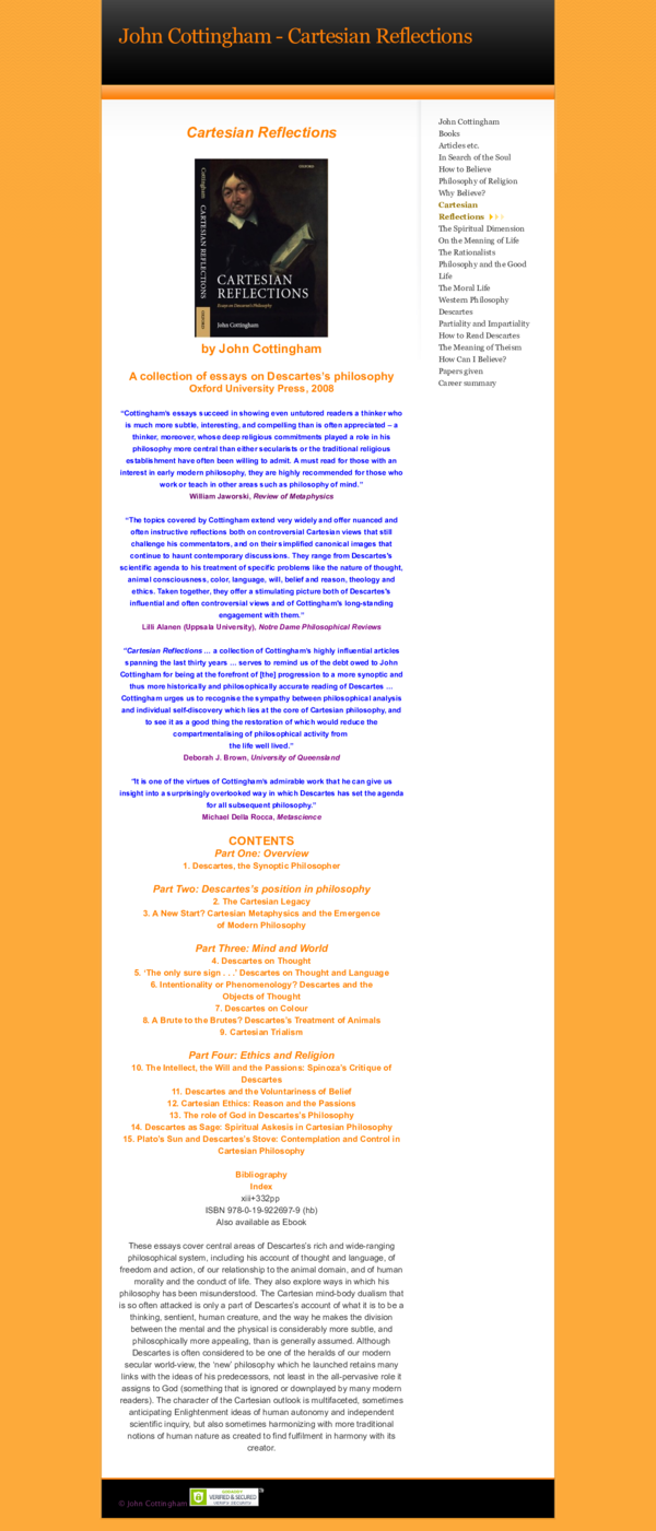 Essays on Descartes is well-suited both for grazing and for focused forays into specific issues, and for that reason, it is a good thing that the essays can be read independently of each other . I hope the collection will get an audience beyond students and scholars of Descartes , if only to give the lie to prevailing stereotypes of Cartesian . . .