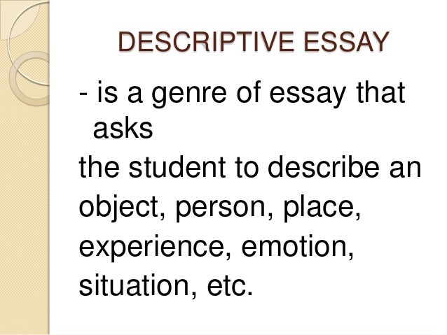 Some of the subjects that are commonly seen in a descriptive essay are as follows: An object , thing, or matter . Since a descriptive essay is made to present and describe a subject, things that have various characteristics can be a great topic . You can write about a flower, a notebook, or any other things under the sun . People .
