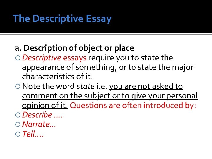 Descriptive essays , derived from the word describe, is a genre of essay that asks the student to describe somethingβobject, person, place , experience, emotion, situation, etc . Writers use the descriptive essay to create a vivid picture of a person, place , or thing .