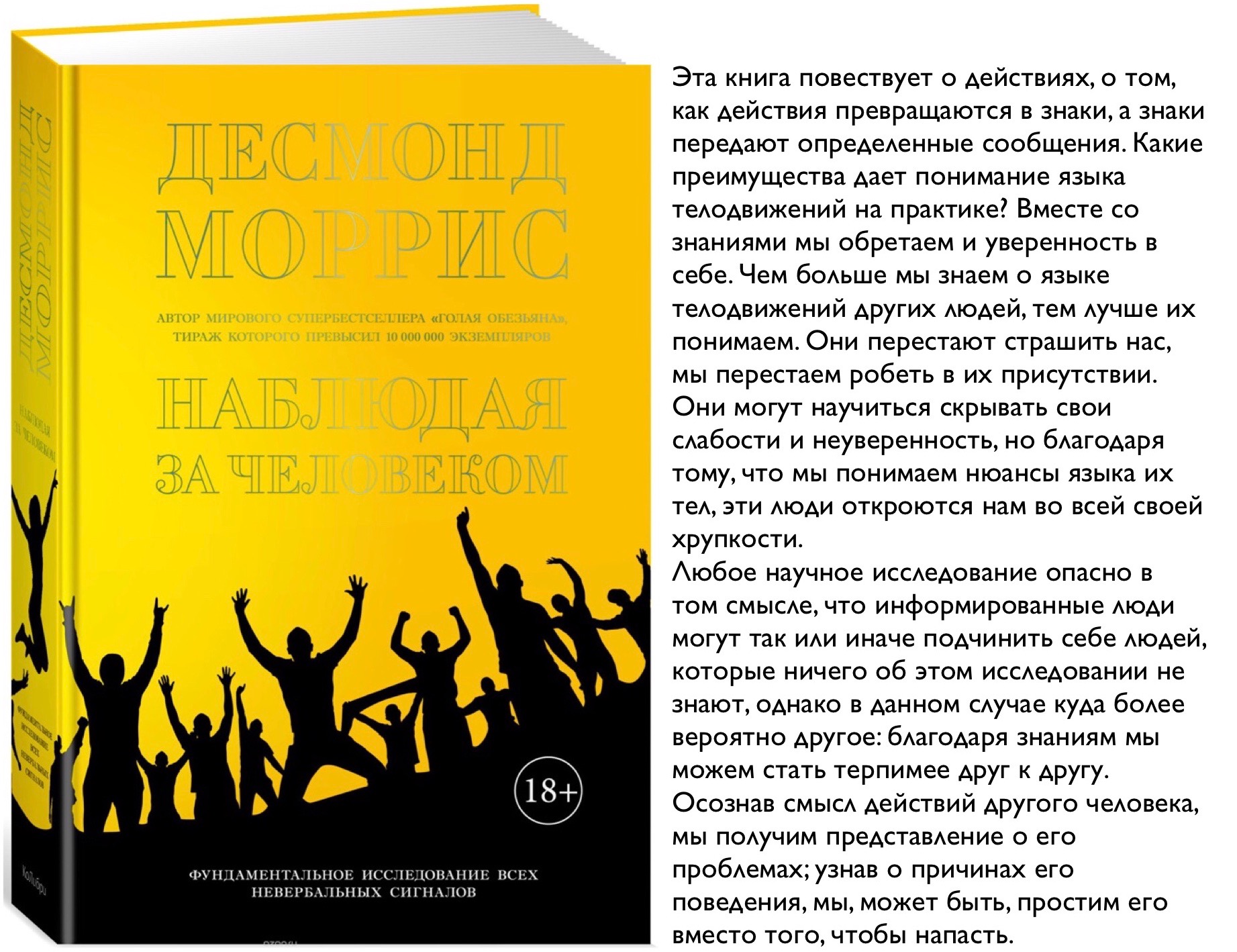 Эта книга повествует о действиях, о том, как действия превращаются в знаки, а знаки передают определенные сообщения. Люди как вид достигли больших высот в конструировании механизмов и в философских размышлениях, но не утеряли животного свойства к физической активности. Именно телодвижения составляют предмет исследований ученого, наблюдающего за людьми. Зачастую человеческая особь не отдает себе отчет в собственных действиях, а значит, эти действия могут многое о ней поведать. Мы настолько сосредоточены на словах, что, кажется, начисто забываем про телодвижения, позы и мимику, выдающие нас с головой.