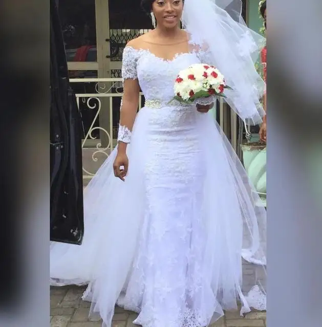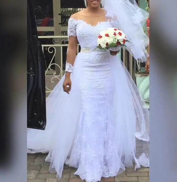 «Detachable Trail 2 Pieces African Wedding Dresses White Lace Long Sleeve Beading Belt Mermaid Removable Skirt Bridal Gowns» по лучшей цене на рынке! Всего за 170$ (16150рублей)